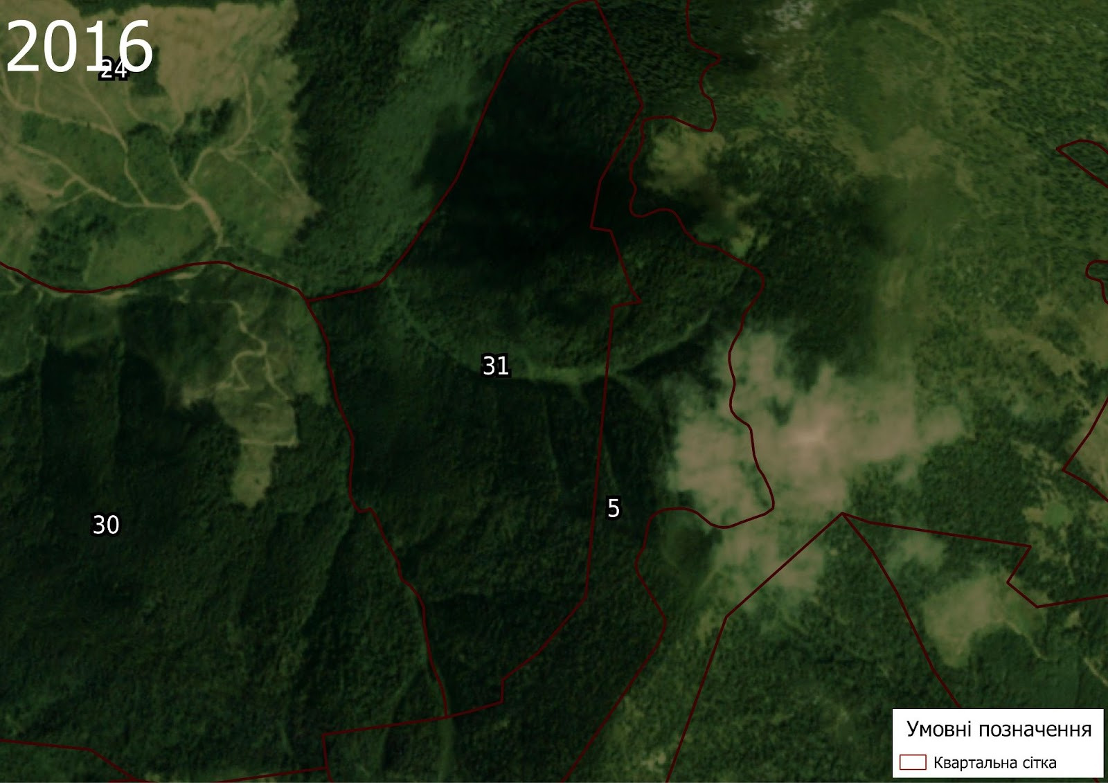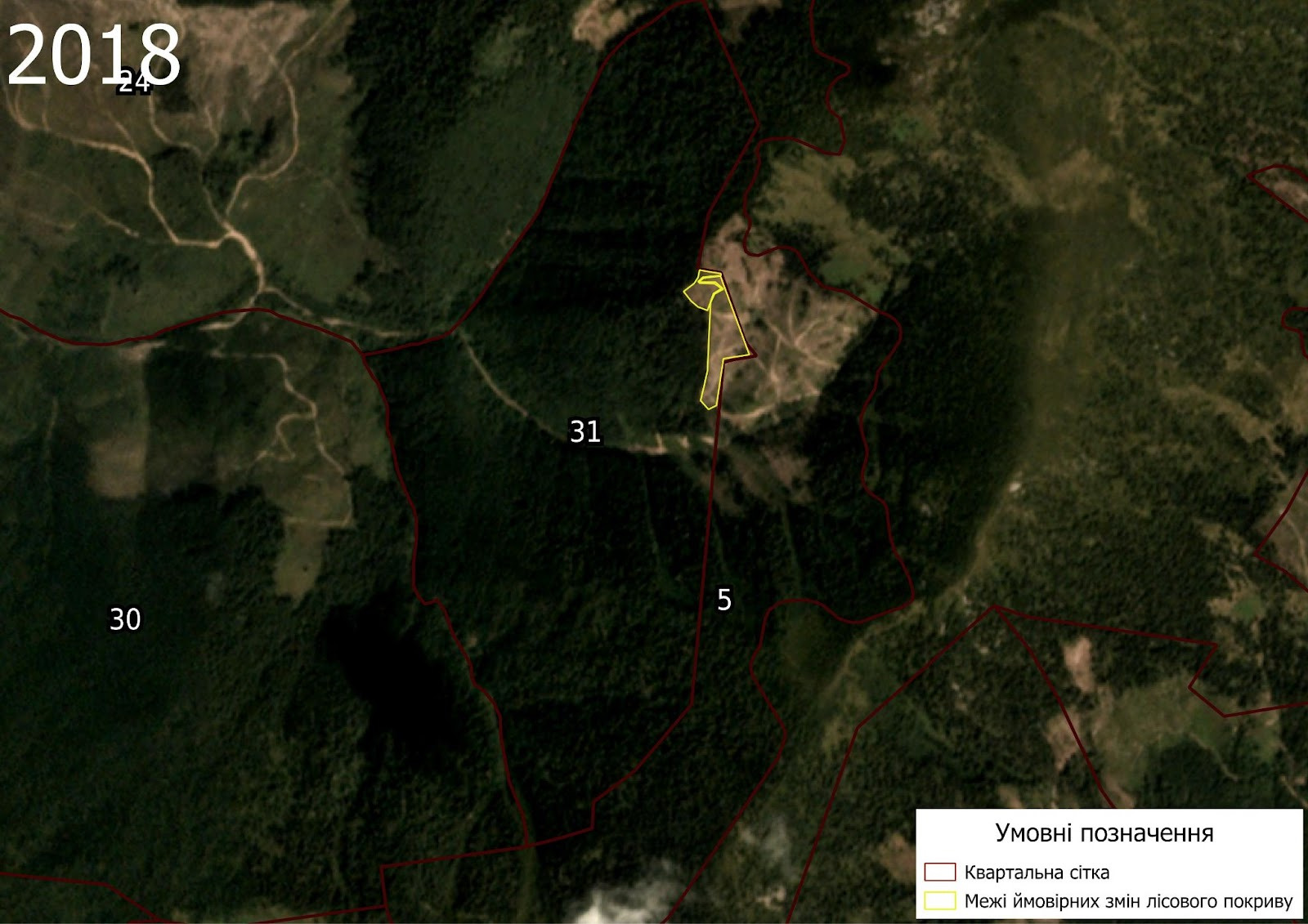 An investigative report by the Ecological Zakarpattia initiative, in cooperation with experts from the NGO ForestCom, has confirmed undeniable signs of large-scale logging activity within the reserve’s boundaries. These operations took place over an area of approximately 1.95 hectares between 2016 and 2018. Today, only moss-covered stumps remain on the site, but composite satellite images from PlanetScope and RapidEye clearly show deforestation in Compartment 31 of Bradulske Forestry (Subcompartments 1, 5, 8, and 9).