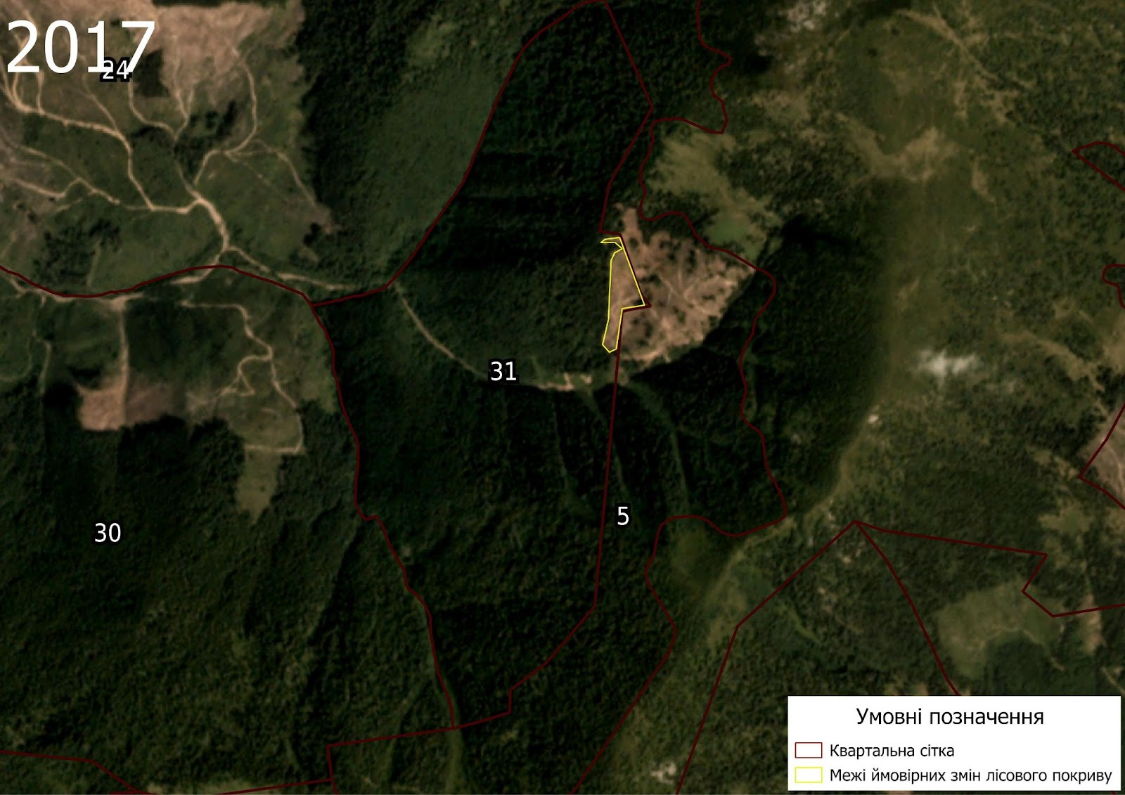 Figure 2. Forest cover of the Mokrianske Forestry Branch with the Stranzul Botanical Reserve (August 2017). Block boundaries are marked in red, and likely forest cover changes are marked in yellow — specifically located in Block 31 (48°27'22.4"N, 23°54'56.8"E).